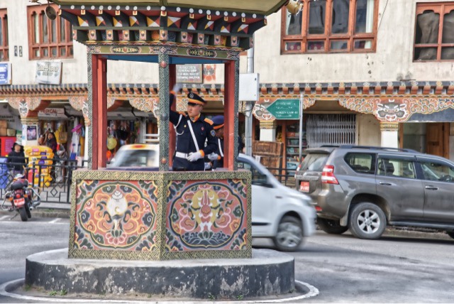 我們來到這個聞名世界的站崗亭,這座亭子雕梁畫棟,六角形的亭子上每邊都畫有寓意吉祥的圖案,也是我們在不丹經常會看到的。在現代化的街道上,有傳統的建築物,有古色古香的小亭,亭內是一個穿現代交通警服裝的警察,各項傳統與現代的交融,卻毫無違和感。