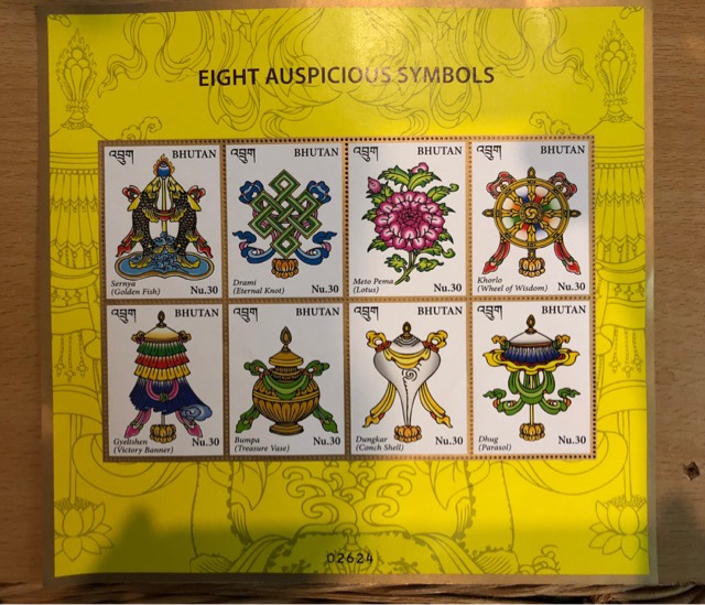 八吉祥是代表佛教的八種法物,象徵吉祥、圓滿、幸福。不丹深受西藏佛教影響,佛殿、唐卡、建築物之上,都不難找到八吉祥的踪影。