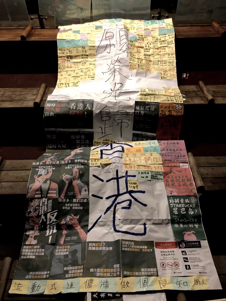 「好呀!」我回答。於是,我和這個小女孩就結伴一齊回去觀塘市區。過程我也沒有和他說太多話,只見他一直都只是低頭看著手機,不斷滑動手機裡數十個 Telegram 群組的訊息。走了一陣,他忽然將手機拿給我看,裡面是一些不同地區有「藍旗」「黑旗」的情況,那時觀塘區氣氛相對平靜,他想去其他地區幫忙。於是,我和他就此分道揚鏢。「小心啲。」除了這些虛得連我也不相信的句子外,我似乎沒什麼可以跟他說,但我想,我們還是可以在各自不同的領域中努力。