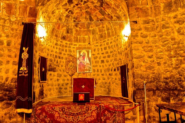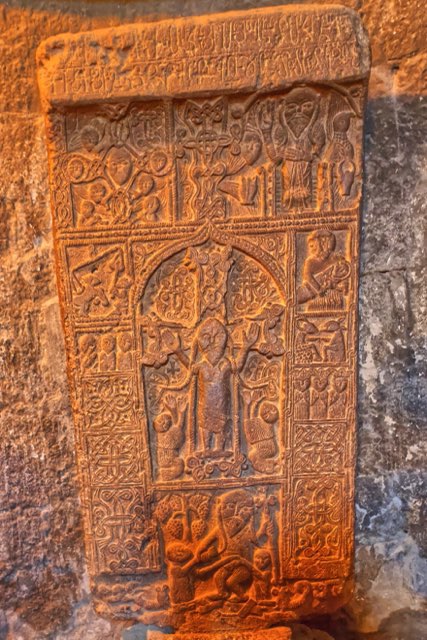 中間的耶穌雕像畫上兩條長長的辮子,據說當時由於亞美尼亞被蒙古人入侵,當時的修士將石碑的雕像都加上這兩條蒙古人的辮子,避免蒙古人認為這是基督教的物品而將其破壞。雖然我總是懷疑這兩條辮子的實際成效,但石碑得以流傳至今,似乎又可以最好的說明。