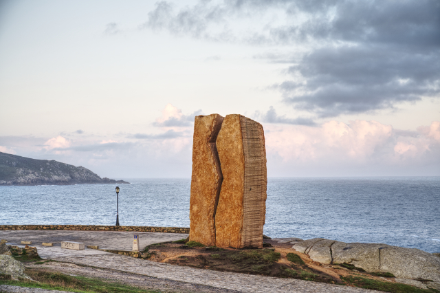 教堂旁邊的斜坡上就是傳說中的 0 km的石柱,是朝聖者夢寐以求到達的終站,人們爭相打卡合照的地方,石柱後則是一個巨大雕塑,名為《傷痕》。是紀念2002年巴拿馬運油輪在Muxía對出海域漏油的事故,事故對海洋生態影響很大,事件前後花了十年才算是收拾好殘局,也令歐盟修例限制單殼及高齡油輪在歐盟海域航行的法例,後知後覺總比沒有反應好,對自然的傷害是不可逆轉,所以我們才要記住過去的事,別要讓悲劇重演。