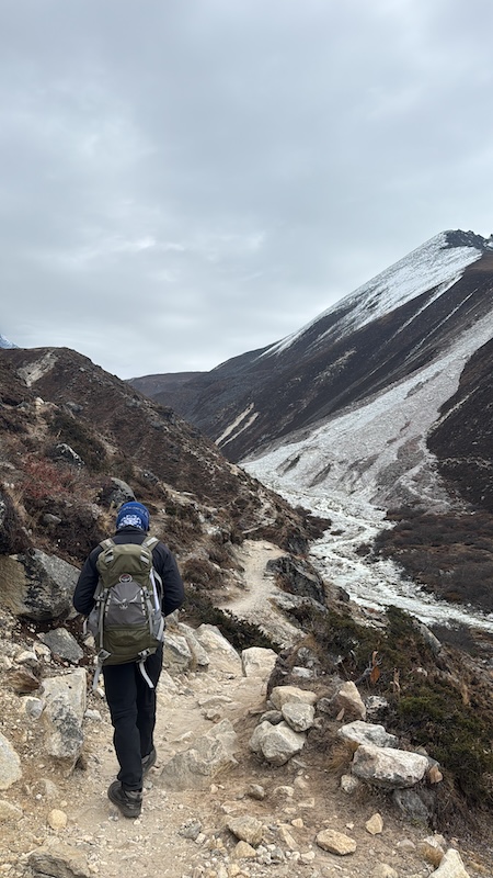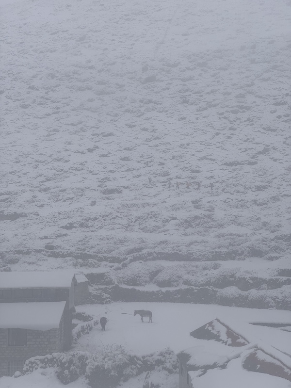 依照行程安排,我們會在 Dingboche 停留兩晚,和 Namche Bazaar 一樣,第二天會作為海拔適應日,會登上附近海拔約 5000 米的 Nangkartshang Peak,再回到Dingboche休息。誰知,當我們第二天早上醒來,推開窗戶,眼前竟是一片陌生的白茫茫——昨夜悄然下起了大雪,把整個村莊覆蓋。這場突如其來的雪似乎打亂了原定計劃,Ram 和幾個導遊聚在一起商量:要不要依計劃行動。