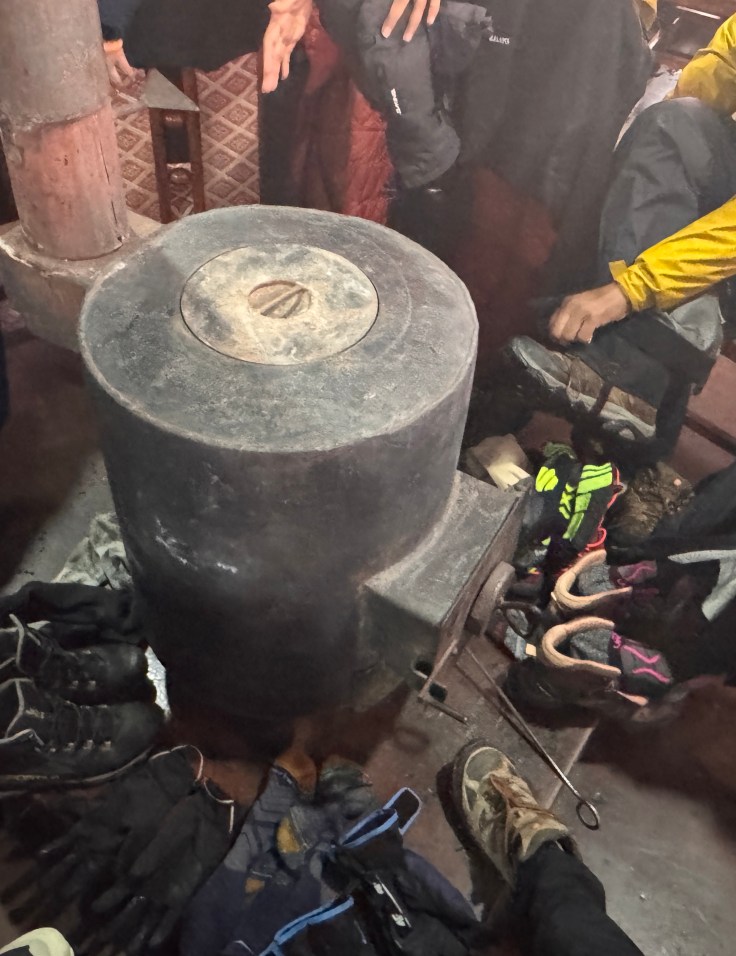 完成每日行程,大家都圍在暖爐,將衣物烘乾。
