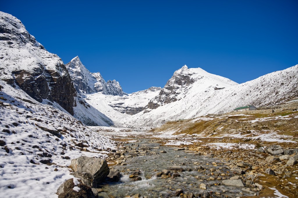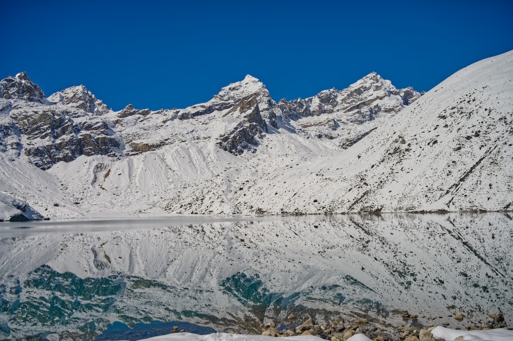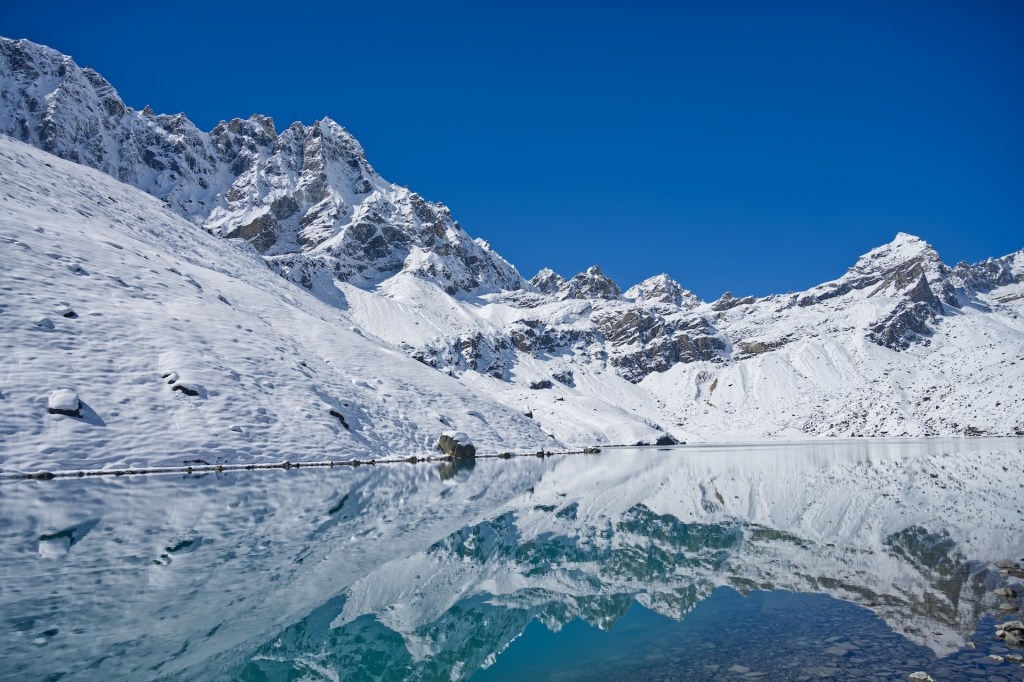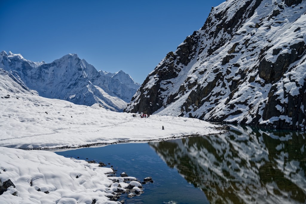 這日一早由 Dole 出發去Gokyo,一開始是滿地泥漿路,鞋子一步一步陷下去,走得狼狽。隨著海拔逐漸升高,泥漿慢慢凝結,路面變成像「思樂冰」,最後就真的踏上了厚厚的冰雪。大家事前都沒有準備雪爪,只能小心翼翼地踩著雪面前行,每一步都格外謹慎。