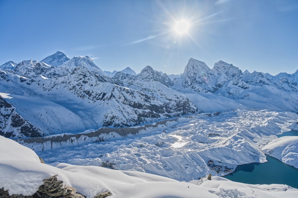 直到早上七點,終於登上 Gokyo Ri,朋友和 Louis 毫不意外的自己先走,比我早一點到達,已經忙於拍照留念。雖然比預期遲,但遲來總好過沒來,登上的一刻身心俱疲,但站在山嶺之上,被群峰環抱還是會令人忘記所有累。